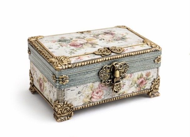 Çiçek desenleri ve altın detaylarıyla öne çıkan, vintage tarzda çok amaçlı dekoratif kutu.